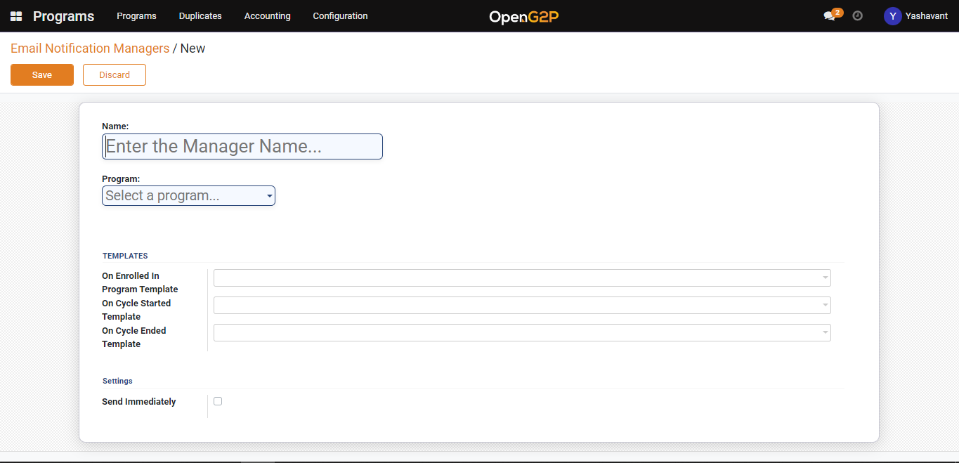 * Select *Send Immediately* to send the email notification to beneficiaries after the program enrollment, at the start of the cycle and at the end of a cycle.