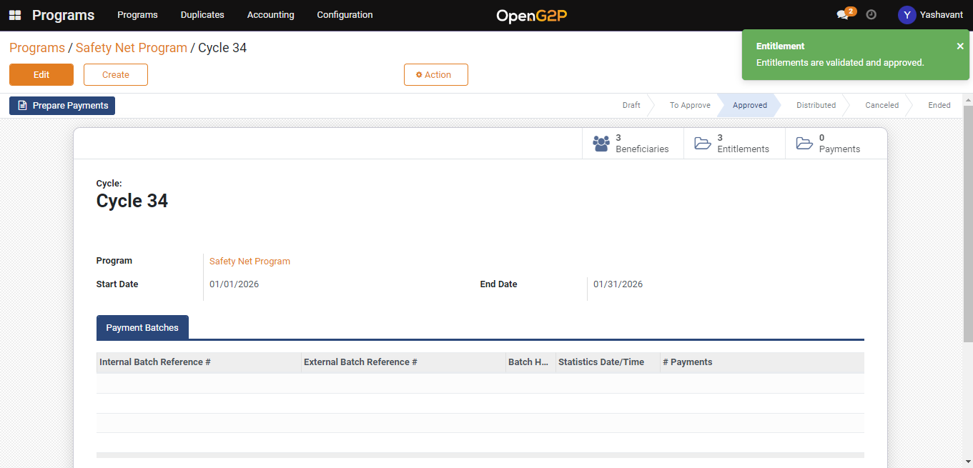 2. Click on the *Prepare Payment* button to create a batch for the approved cycle entitlements.