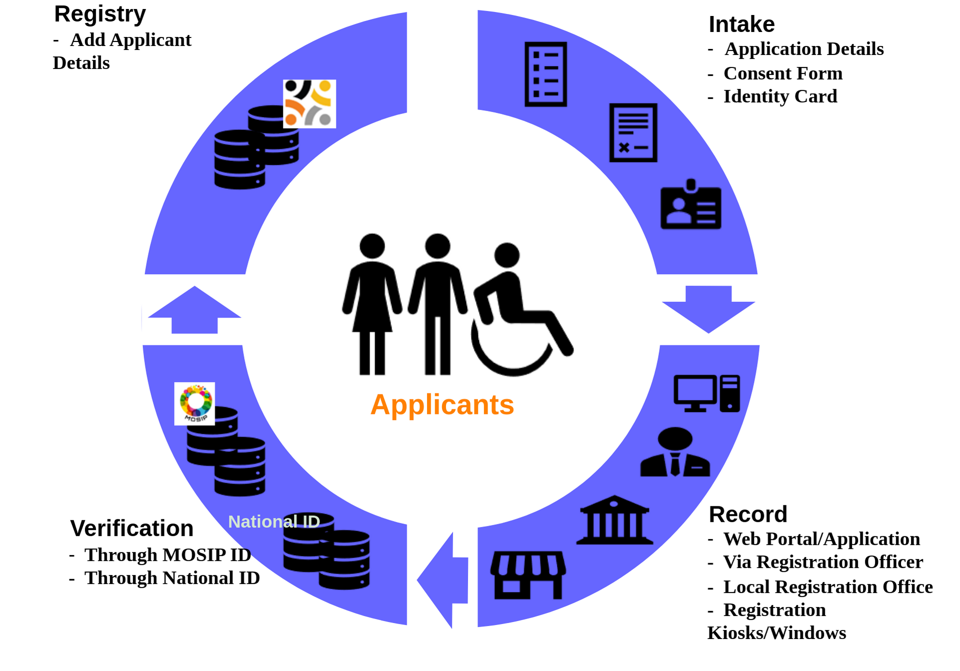 Registration aims to provide detailed records for Eligibility Assessment in the Registry. It must be noted that at this stage, the people are referred to as applicants or registrants. Once the applicants/registrants pass the eligibility criterion set by the program manager, they become eligible to enrol in the program and are referred to as beneficiaries.