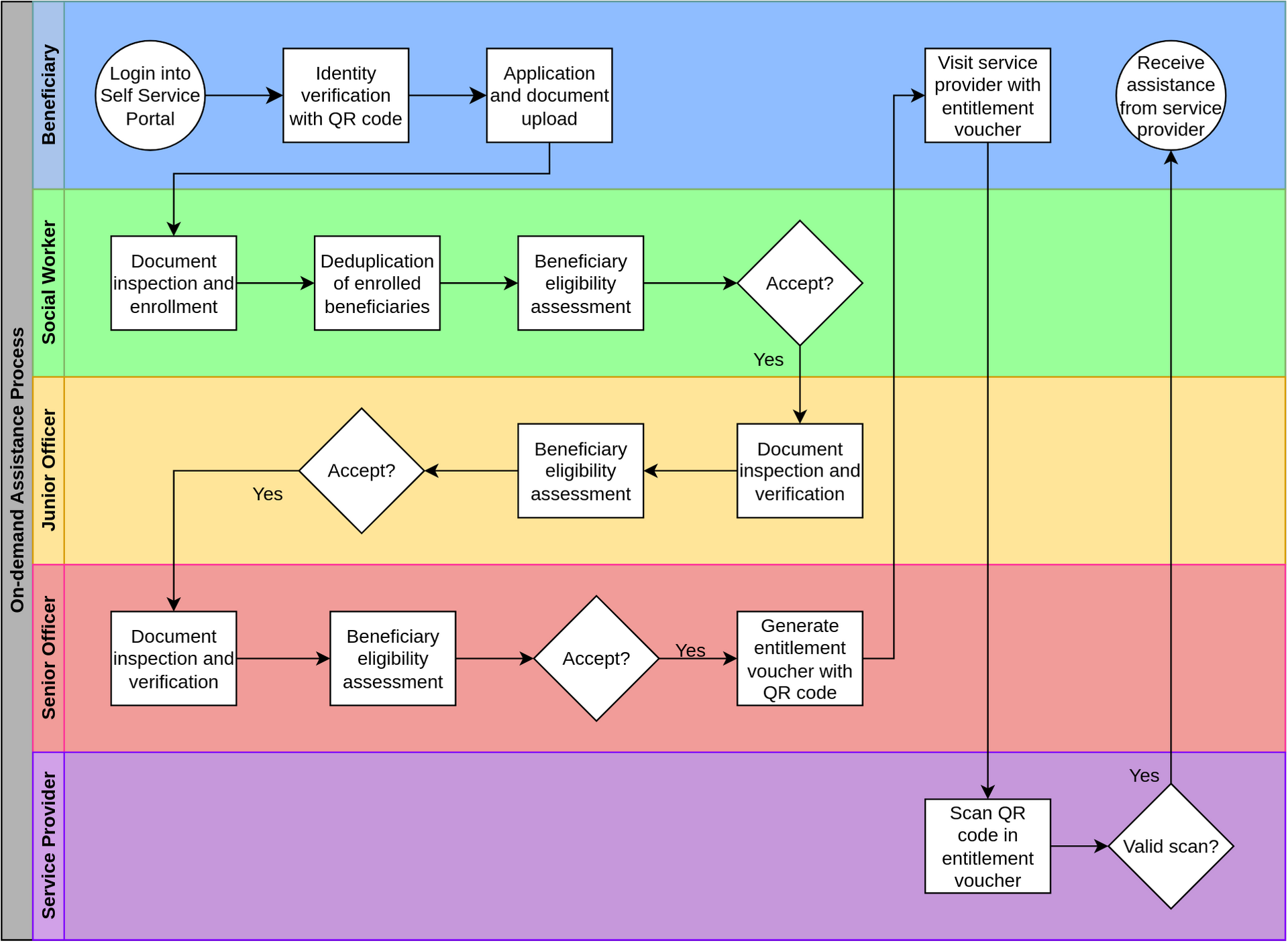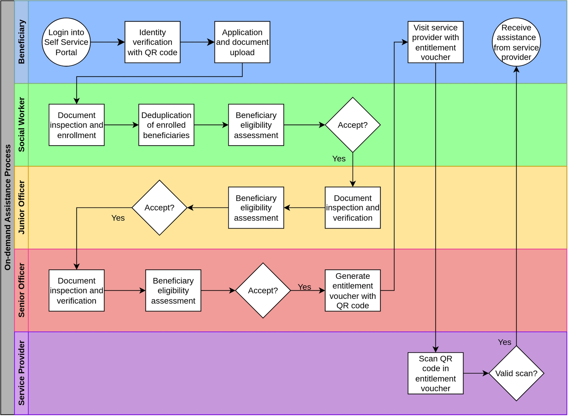 On-demand assistance is especially useful for scenarios like urgent surgeries, treatments, and other crises. However, to prevent instances of fraud, it is imperative to do a thorough assessment of beneficiary entitlement. This section details one reference implementation using multiple stages of approvals.