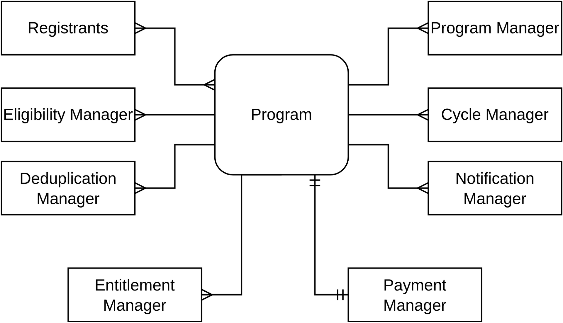 A program is composed of various managers, each of which configures the parameters for a specific program management process such as eligibility determination, deduplication, and entitlement. The diagram below shows the relationships of these managers with the program.
