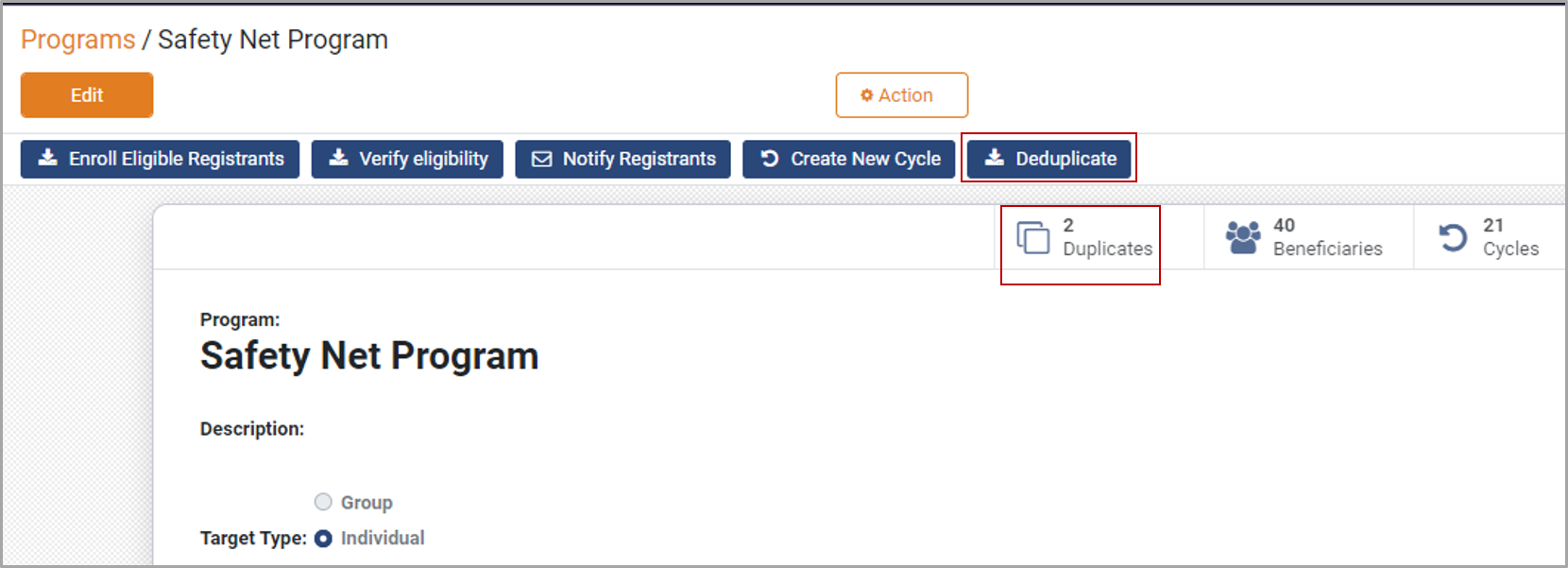 Deduplication of registrants is a one-click operation once Deduplication Managers are added to the program. The Deduplication Manager does not distinguish between original and duplicate records, and all beneficiaries with the same field value - as configured for duplicate detection - are listed as duplicates.
