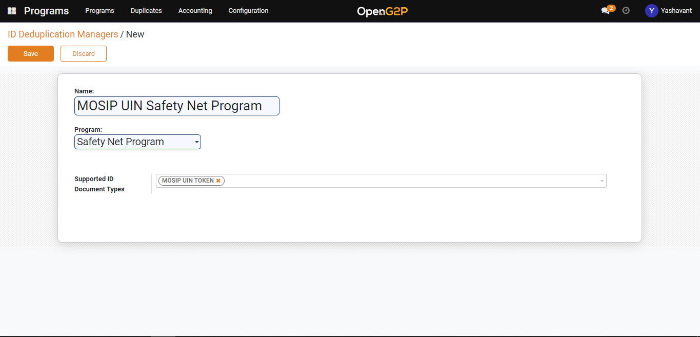 4. In the ID deduplication manager creation page provide a name for the ID deduplication manager, and select the program name and the ID type from the Supported ID Document Types drop-down.