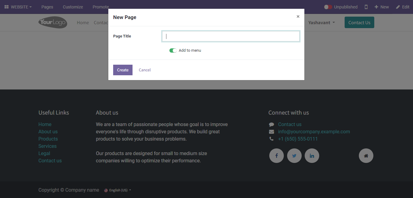 5. Enter the page title and click on *Create* button under New Page pop-up window.