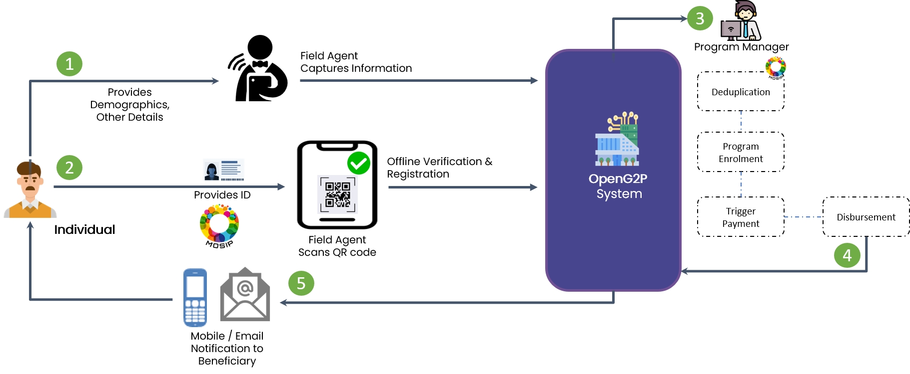 While on-demand and administrative-driven approaches are distinct models described by the World Bank, the registration process operates in a spectrum between these two models. For example, a program may allow the applicants to register individually (on-demand) but only in a specific time window (administrative-driven). OpenG2P platform has a flexible implementation and caters to varied approaches across different registration modalities and programs through its various Registration Interfaces.