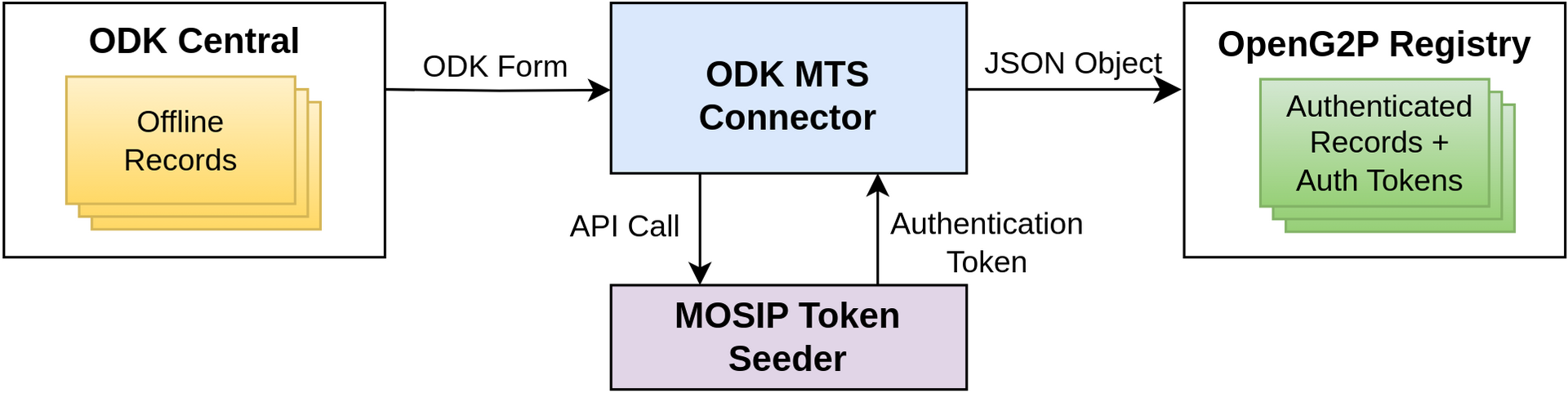 A program administrator must create an ODK MTS Connector to map the ODK forms in ODK Central to the OpenG2P registry. MTS Connector is the glue that holds ODK Central, MTS, and OpenG2P Registry together.