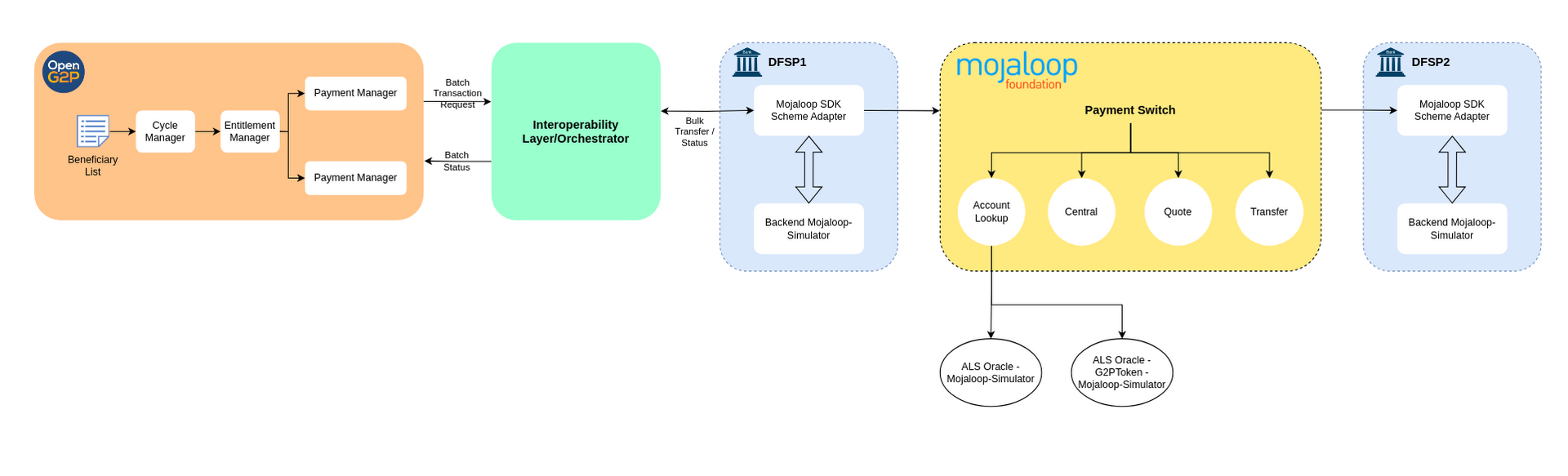 This page describes the integration of OpenG2P with the Mojaloop switch enabling cash transfer from one bank (treasury bank, for instance) to an individual's bank account. The connection to Mojaloop is achieved via an intermediate interoperability layer implemented by a Payment Hub (PH).