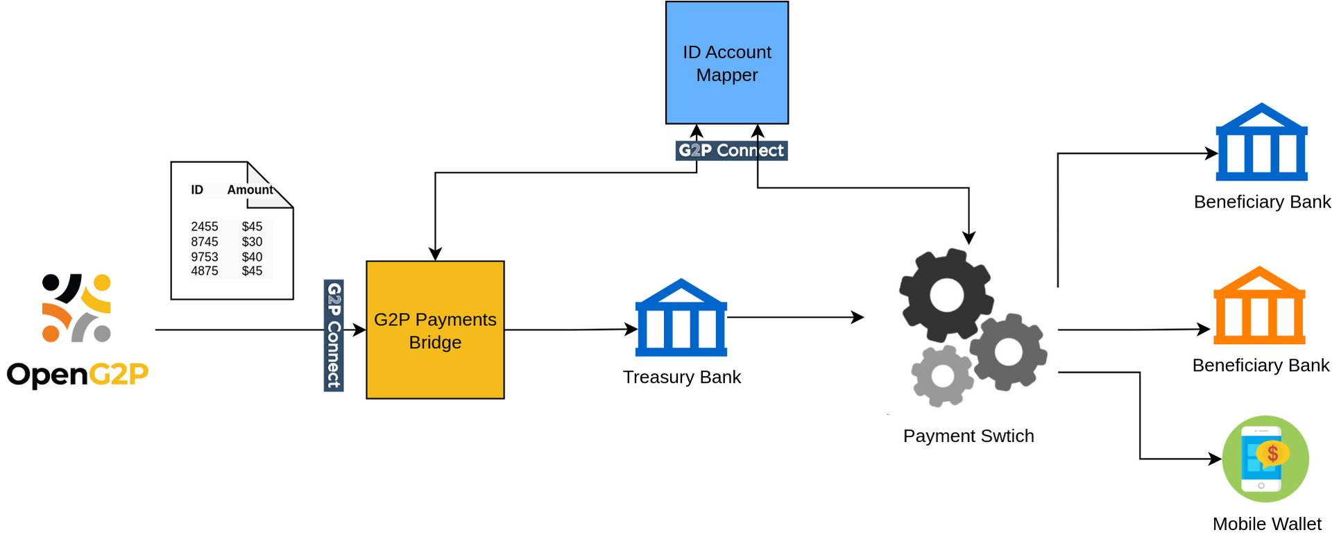 The module is envisaged to exist as an independent module in bridging the gap between a G2P system and a bank to initiate large-scale G2P cash transfers. Being specific to G2P transfers, (and not P2G, P2P, P2M, etc), the module promises to be low cost, simple in design, easy to install, and highly performant as real-time fast transfers are not a requirement in most social benefit transfer scenarios. However, the volume of transfers is expected to be large.