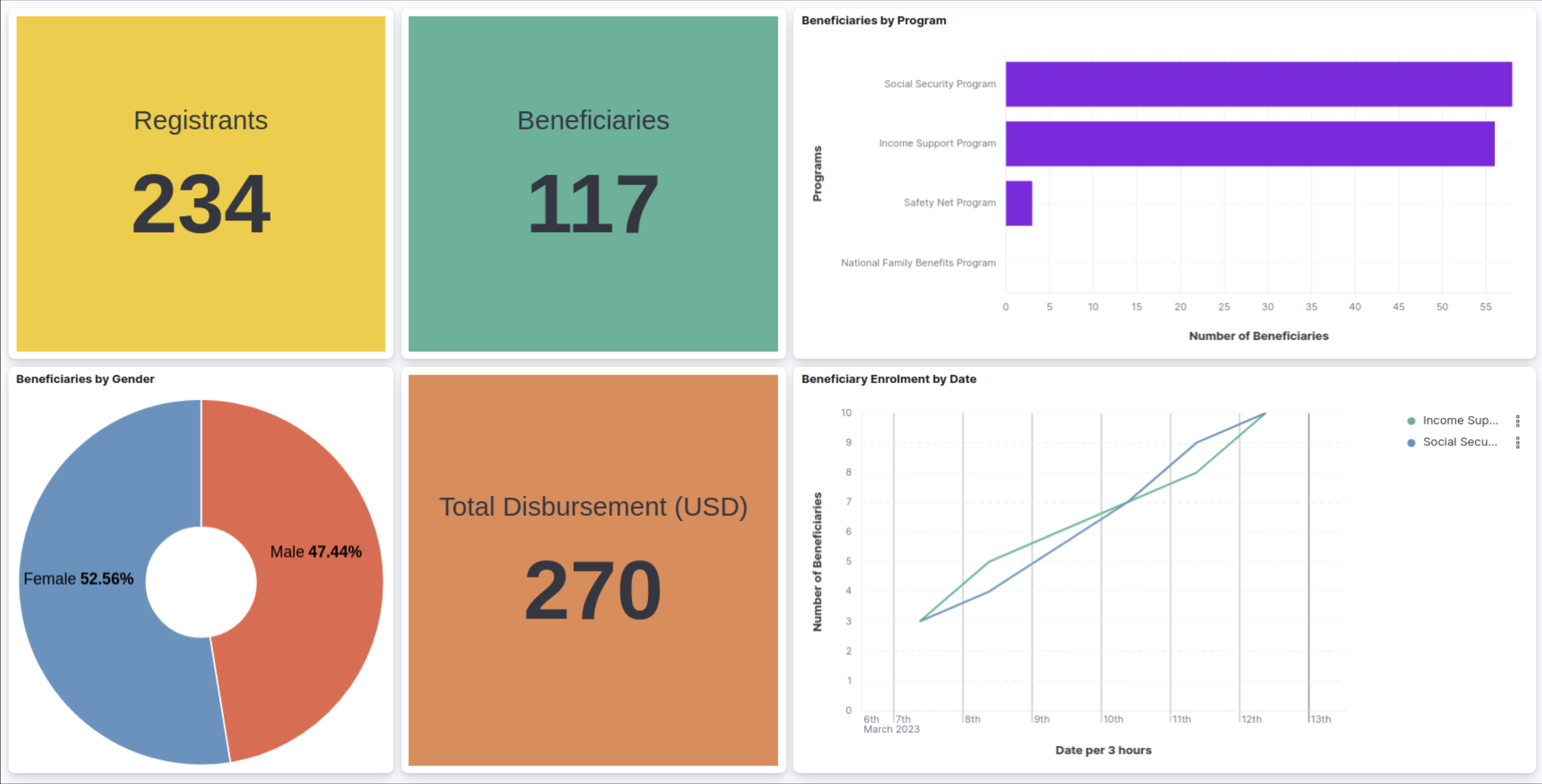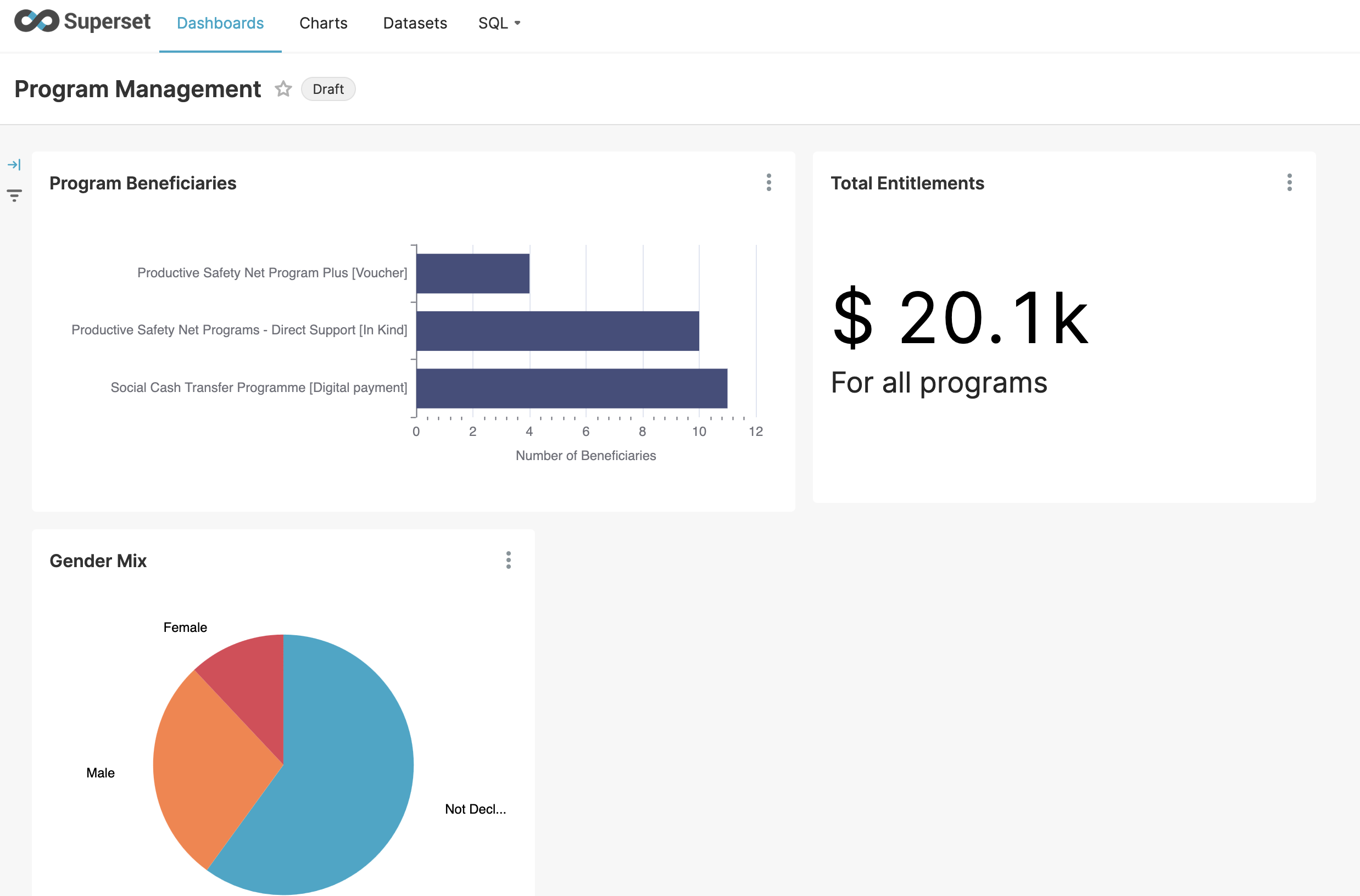 Apache Superset offers SQL query based datasets and charts for visualisation of data. OpenG2P offers pre-configured dashboards for visualisation. Refer to the [deployment instructions](https://docs.openg2p.org/1.2/deployment/openg2p-modules-deployment/reporting-deployment).