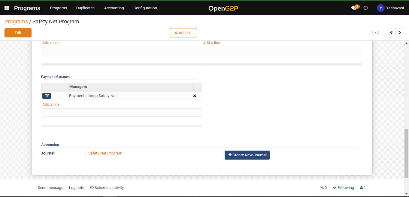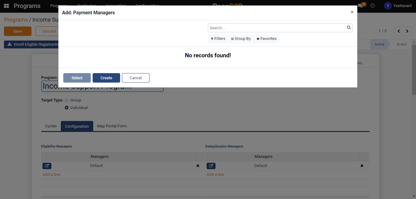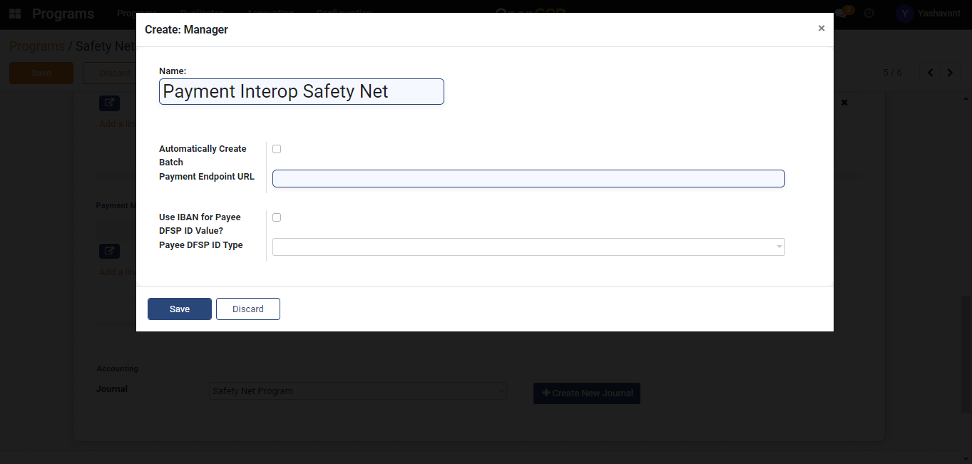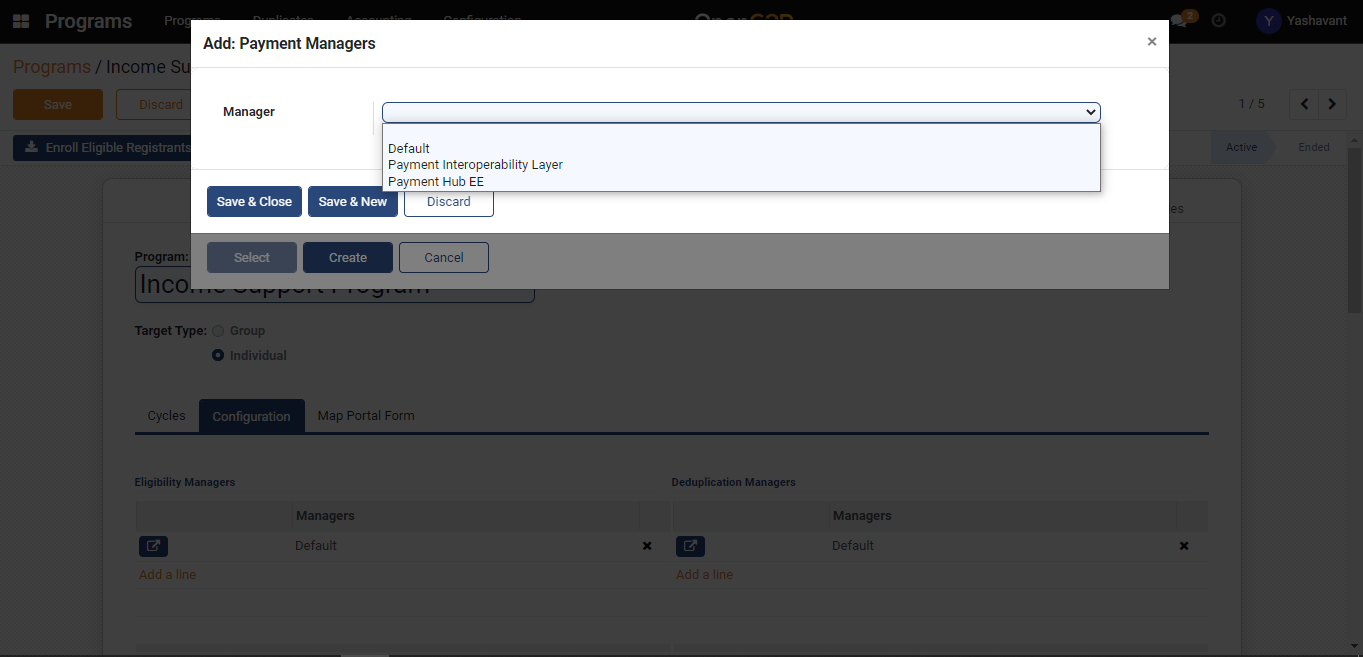 7. If a payment manager is already created ([Create Payment Manager](https://docs.openg2p.org/1.2/user-guides/platform-guides/eligibility-and-program-enrollment/program/create-manager-type/create-payment-manager-types)), search and select the same or else once the name is provided to the program manager, *Create and Edit* buttons will appear. Click on *Create and Edit* to create a payment manager.