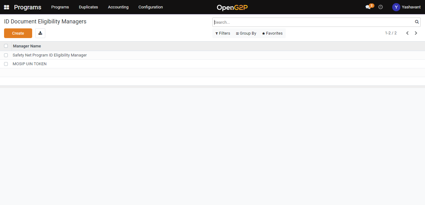 ID Document Eligibility Managers screen provides dashboard view which lists all the Manager Names and the Program list.