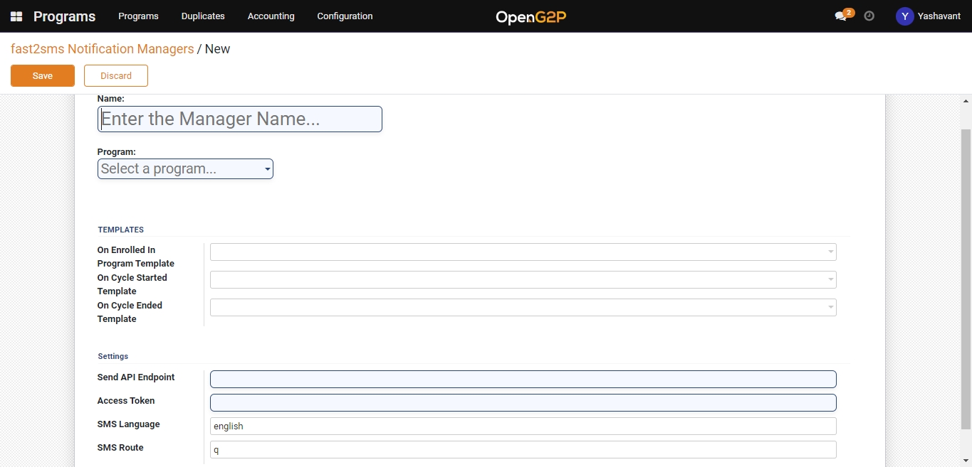 Click on Configuration and then on Fast2SMS Notification Manager.