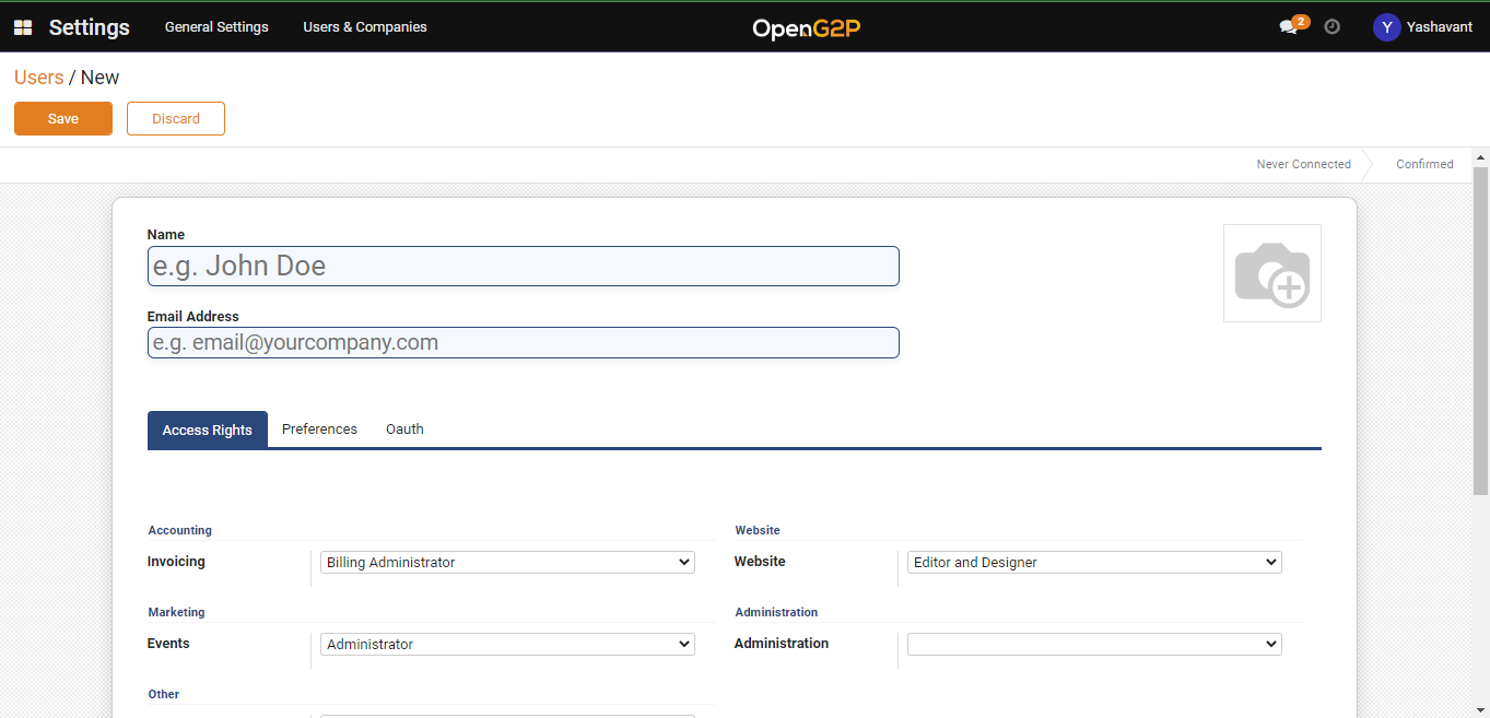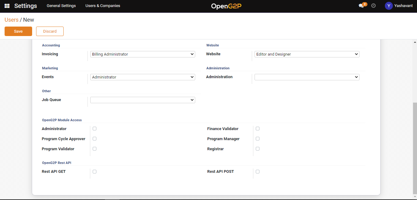 <table><thead><tr><th width="280">Feature</th><th>Description</th></tr></thead><tbody><tr><td><strong>Accounting</strong></td><td><p><strong>Invoicing</strong></p><p>Select the appropriate role in the drop-down. The valid values are:</p><ul><li>Billing</li><li>Billing Administrator</li></ul></td></tr><tr><td><strong>Inventory</strong></td><td><p><strong>Inventory</strong></p><p>Select the appropriate role in the drop-down. The valid values are:</p><ul><li>User</li><li>Administrator</li></ul></td></tr><tr><td><strong>Website</strong></td><td><p><strong>Website</strong></p><p>Select the appropriate role in the drop-down. The valid values are:</p><ul><li>Restricted Editor</li><li>Editor and Designer</li></ul></td></tr><tr><td><strong>Marketing</strong></td><td><p><strong>Events</strong></p><p>Select the appropriate role in the drop-down. The valid values are:</p><ul><li>Registration Desk</li><li>User</li><li>Administrator</li></ul></td></tr><tr><td><strong>Administration</strong></td><td><p><strong>Administration</strong></p><p>Select the appropriate role in the drop-down. The valid values are:</p><ul><li>Registration Desk</li><li>User</li><li>Administrator</li></ul></td></tr><tr><td><strong>Other</strong></td><td><p><strong>Helpdesk</strong></p><p>Select the appropriate role in the drop-down. The valid values are:</p><ul><li>User: Personal tickets</li><li>User: Team ticktets</li><li>User</li><li>Helpdesk Manager</li></ul><p><strong>Job Queue</strong></p><p>Select the appropriate role in the drop-down. The valid value is:</p><ul><li>Job Queue Manager</li></ul></td></tr><tr><td><strong>OpenG2P Module Access</strong></td><td><p>Check the appropriate role. The valid values are:</p><ul><li>Administrator</li><li>Finance Validator</li><li>Program Cycle Approver</li><li>Program Manager</li><li>Program Validator</li><li>Registrar</li><li>Support Person</li></ul></td></tr><tr><td><strong>OpenG2P Documents Module</strong> </td><td><p></p><p>Check the appropriate option. The valid values are:</p><ul><li>Document Admin</li><li>Document Write</li><li>Document Read</li></ul></td></tr><tr><td><strong>OpenG2P Rest API</strong></td><td><p></p><p>Check the appropriate option. The valid values are:</p><ul><li>REST API GET</li><li>REST API POST</li></ul></td></tr><tr><td><strong>Other</strong></td><td><p></p><p>Check the appropriate option. The valid values are:</p><ul><li>View Server Environment Configuration</li></ul></td></tr><tr><td><strong>Save</strong></td><td>Click the <strong>Save</strong> button to save the data</td></tr><tr><td><strong>Discard</strong></td><td>Click the <strong>Discard</strong> button to close the Users / New screen</td></tr></tbody></table>