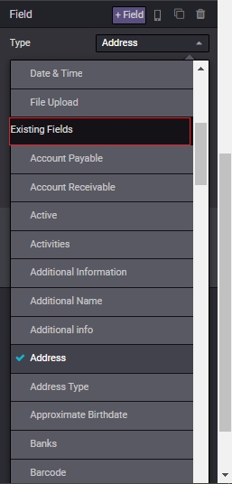 To add fields that are not available under Existing Fields, use the type Custom Field and add desired fields.