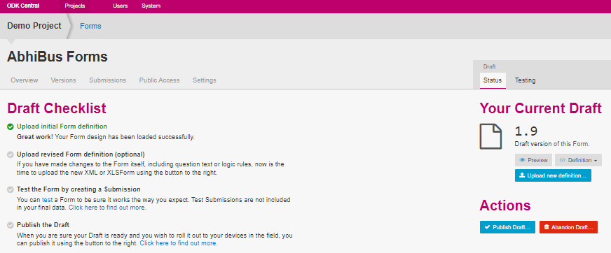 <figure><img src="https://252389534-files.gitbook.io/~/files/v0/b/gitbook-x-prod.appspot.com/o/spaces%2FCwMntokukpQZjoCcqMwL%2Fuploads%2FpIqBlNmVf8d8IVA8xACv%2FODK-central-home%20page-Projects-%20demo.png?alt=media&#x26;token=8458fa72-f157-4c7a-bbb6-3464686bafe3" alt=""><figcaption><p>ODK home screen</p></figcaption></figure>