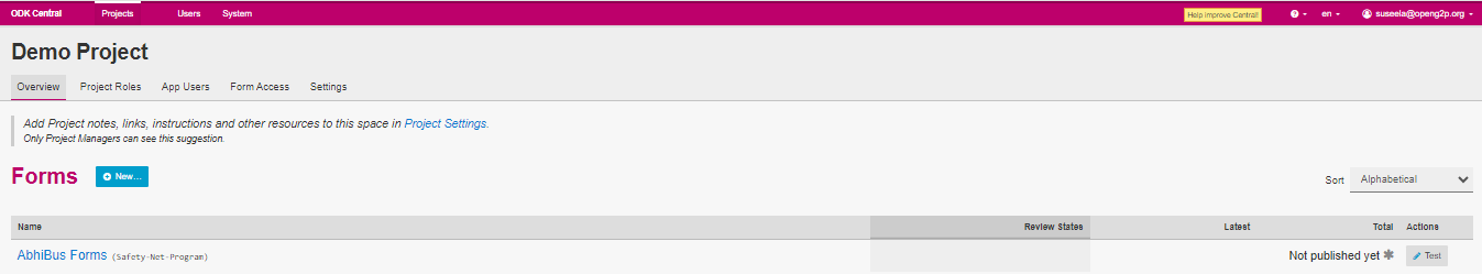 * A user must have an Administrator role in ODK Central. See [Create User and Assign Role](https://docs.openg2p.org/1.2/user-guides/platform-guides/eligibility-and-program-enrollment/settings/assign-roles-to-users) guide