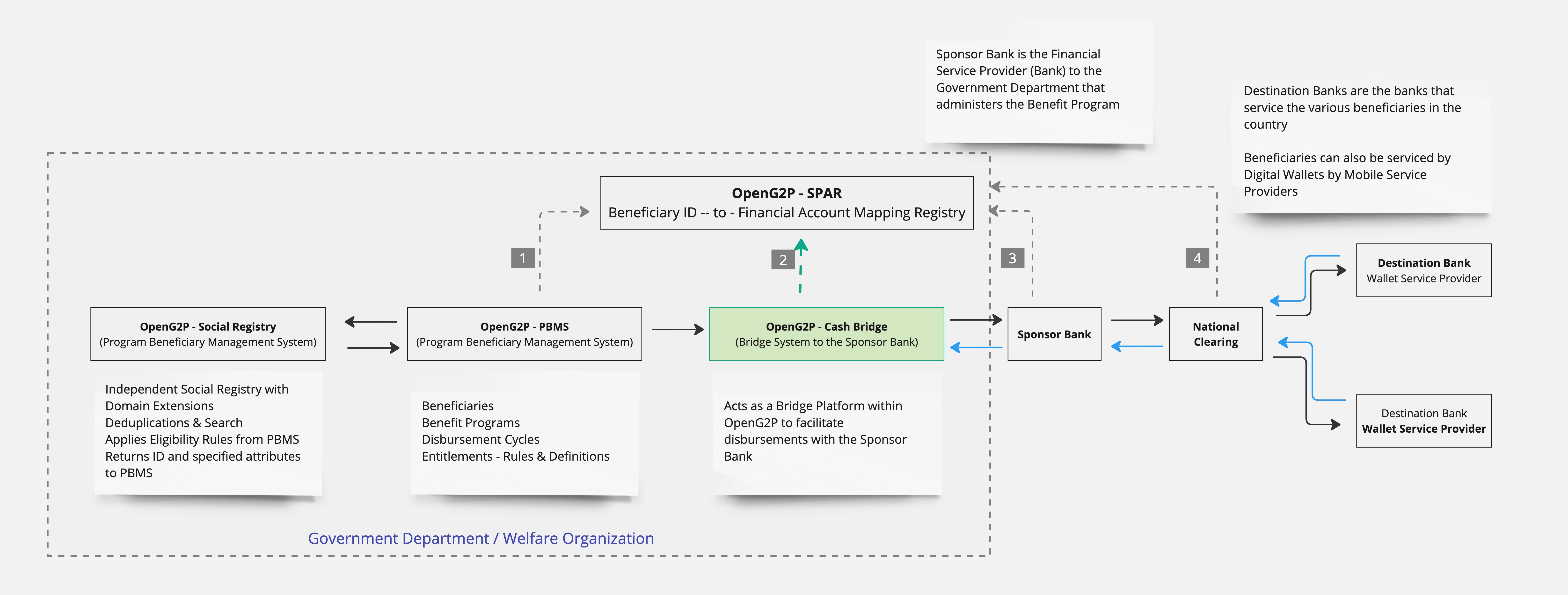 The G2P Bridge subsystem bridges the PBMS module with the Sponsor Bank to effect large scale / high volume beneficiary transfers. Being a G2P system (not a P2G, P2P, P2M, etc), the platform does not desire to offer high performance and real time transfers, since these features are not typically required in a G2P transfer chain. Rather, the platform is designed to operate asynchronously and emphasises on high volumes, ease of use, low cost of operations and efficient reconciliation.
