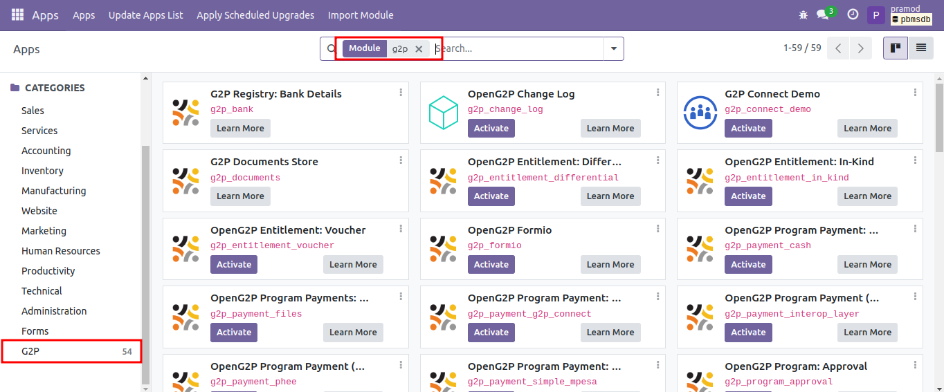 Similarly, you can activate the other modules for PBMS based on your project requirements.