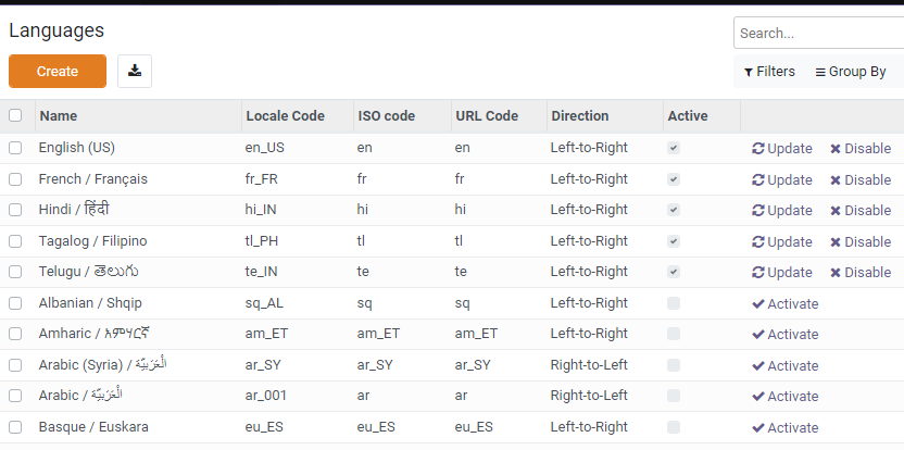 OpenG2P platform users can view the language locale codes, ISO codes, URL codes, and activation status for each language from a single view.