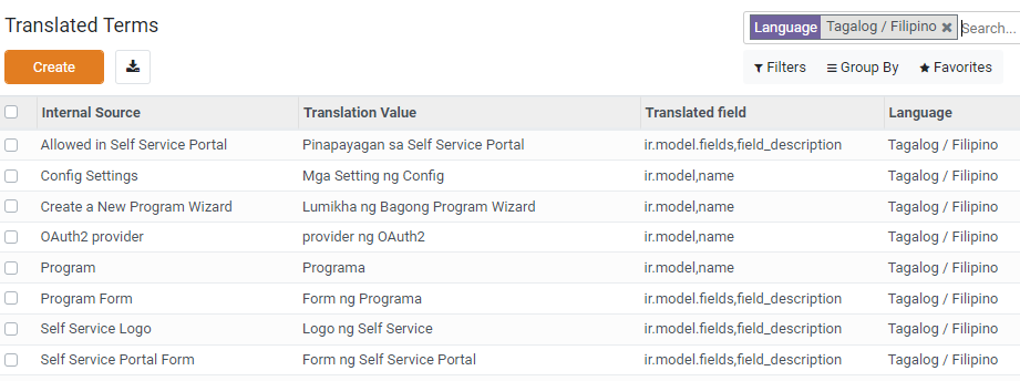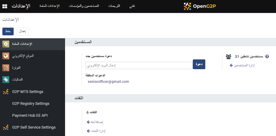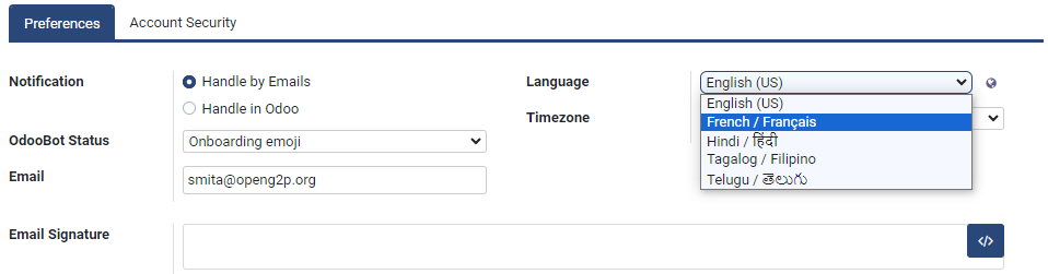 The OpenG2P platform supports internationalization and can localize the platform for a specific region and language. Internationalization converts the text in the menus, labels, and messages into the local language. Users of the OpenG2P platform can configure the local language from preferences.