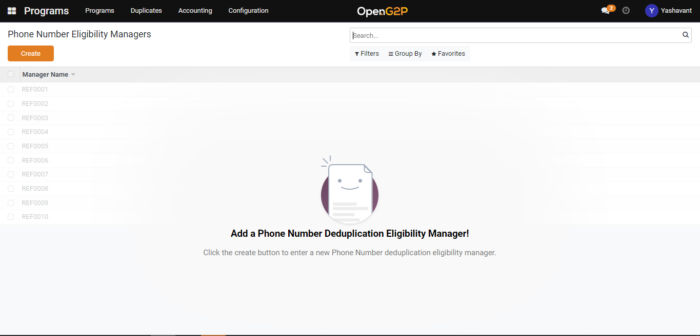3. Click the Create button to navigate to the Phone Number Deduplication manager creation page.