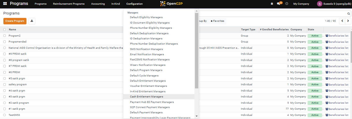 2. Click the ***Configuration*** in the menu bar and then select ***Cash Entitlement Managers***.