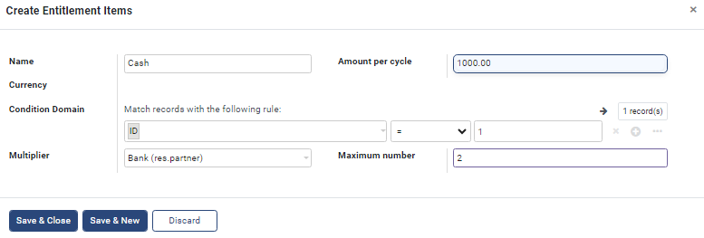<table><thead><tr><th width="183">Field</th><th>Description</th></tr></thead><tbody><tr><td>Name</td><td>Enter the name of the entitlement items.</td></tr><tr><td>Amount per cycle</td><td>Enter the amount of the entitlement items that has to be disbursed per cycle.</td></tr><tr><td>Currency</td><td>Enter the currency type of the entitlement items</td></tr><tr><td>Condition Domain</td><td><ol><li>Click the <em><strong>Add filter</strong></em> button.</li><li>Set the rules to filter the beneficiaries based on the criteria.</li></ol><p>For example, the rule to search for criteria is selected as ID in the drop-down, assign the mathematical operation (for example, = is selected) for the rule, and enter the value for the rule ( for example, 1 is selected). Similarly you have added rules.</p></td></tr><tr><td>Multiplier</td><td>Select the appropriate value from the drop-down</td></tr><tr><td>Maximum number</td><td>Enter the maximum number for the multiplier</td></tr></tbody></table>