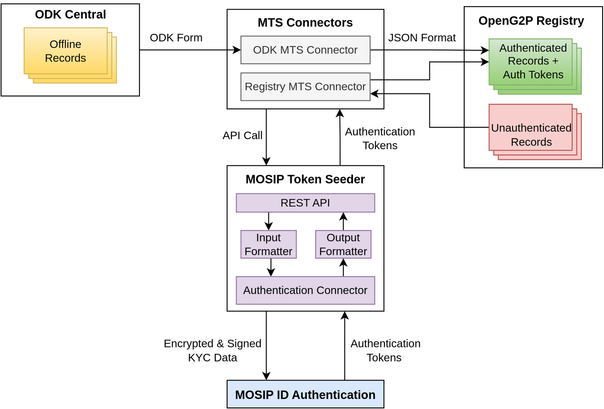 OpenG2P integrates with MOSIP Token Seeder (MTS) using MTS Connector to authenticate registrants registered using the ODK Collect App. The Unique ID Number (UIN) and demographic details provided by registrants are verified by calling APIs of the MOSIP ID Authentication (IDA) system. The MOSIP IDA responds with an Authentication Token upon successful verification. MTS is a standalone service offered by MOSIP.