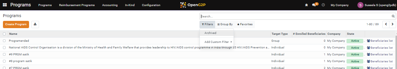 7. In the ***Programs*** screen, click the ***Filters*** button and select the option ***Archived***.