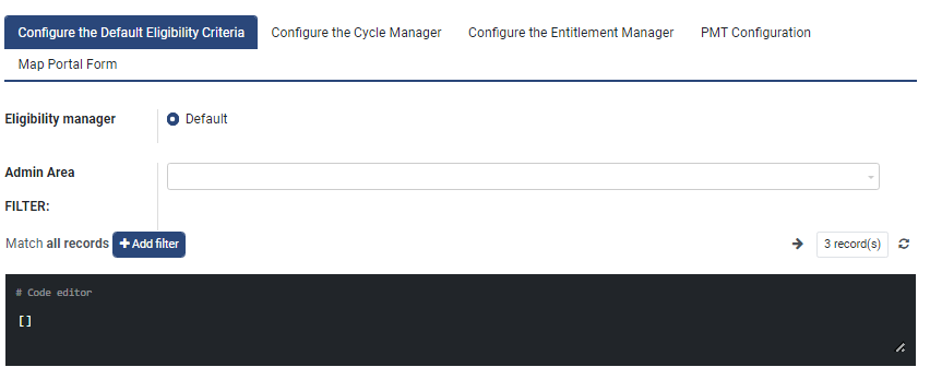 <table><thead><tr><th width="185">Field</th><th>Description</th></tr></thead><tbody><tr><td>Eligibility manager</td><td>Default option is selected by default</td></tr><tr><td>Admin Area</td><td>Enter the admin area</td></tr><tr><td>Filter</td><td></td></tr><tr><td>Match all records</td><td>Retrieves the data which matches all records</td></tr><tr><td><img src="https://1895884874-files.gitbook.io/~/files/v0/b/gitbook-x-prod.appspot.com/o/spaces%2FnKdOHLbjDdIln1QDNwSx%2Fuploads%2Fgit-blob-e0df5956b60c1385b9bb3c387bd0e70d2c0ccb32%2Fnumber-of-records.png?alt=media" alt="" data-size="original"></td><td><p>Click the <em><strong>Records</strong></em> button. The <em><strong>Selected records</strong></em> screen is displayed.</p><p><em>Note:</em></p><ul><li><em>By default the list of three records are listed in the <strong>Selected records</strong> screen.</em></li><li><em>Click the <strong>Cancel</strong> button to close the <strong>Selected records</strong> screen.</em></li></ul></td></tr><tr><td><img src="https://1895884874-files.gitbook.io/~/files/v0/b/gitbook-x-prod.appspot.com/o/spaces%2FnKdOHLbjDdIln1QDNwSx%2Fuploads%2Fgit-blob-6005b223022a4c82d102fe64730d8448fa844d44%2Freferesh-button.png?alt=media" alt="" data-size="original"></td><td>Click the <em><strong>Refresh</strong></em> button to refresh the screen</td></tr><tr><td>Add filter</td><td><p>Click the <em><strong>Add filter</strong></em> button to set eligibility criteria using Domain Filters. You may set multiple eligibility criteria.</p><ol><li>Click the <em><strong>Add filters</strong></em> button. The multiple criteria fields are displayed.</li><li>Select the multiple criteria such as ID, condition and count.</li><li>Click the <strong>x</strong> button to remove the entry in the criteria fields.</li><li>Click the <strong>+</strong> button to add new multiple criteria field.</li><li>Click the <strong>...</strong> option to display fields in <em><strong>Any of</strong></em> section. The multiple criteria fields are displayed.</li></ol><p><em>Note: You can click the <strong>...</strong> option to add n number of <strong>Any of</strong> section</em></p><ol start="6"><li>The value chosen in the multiple criteria fields are displayed in the <em><strong>Code editor</strong></em>.</li><li>In the Match records chose one of the followings:</li></ol><ul><li>Select <em><strong>All</strong></em> to display the data belongs to <em><strong>All</strong></em> section</li><li>Select <em><strong>Any</strong></em> to display the data belongs to <em><strong>Any</strong></em> <em><strong>of</strong></em> section</li></ul></td></tr></tbody></table>