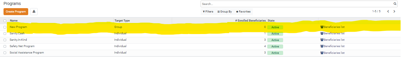 ***Programs*** screen provides a dashboard view that lists all the available Program Names, Target Type, Number of Enrolled Beneficiaries against each program, State (whether active/inactive), and the Beneficiaries list.