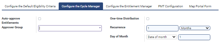 <table><thead><tr><th width="247">Field</th><th>Description</th></tr></thead><tbody><tr><td>Auto-approve Entitlements</td><td><p>Check the option if the auto-approve entitlements is required.</p><p><em>Note:</em></p><p><em>Set entitlements via rules, without any manual approvals.</em></p></td></tr><tr><td>Approver Group</td><td><p>Select the approver group in the drop-down.</p><p><em>Note:</em></p><p><em>The group name of the user who has permission to approve cycles. See</em> <a href="../../administration/role-based-access-control/user-guides/assign-roles-to-users"><em>Create User and Assign Role</em></a><em>.</em></p></td></tr><tr><td>One-time Distribution</td><td><p>Check the option if the distribution happens one-time</p><p>Note:</p><ul><li>If one-time distribution option is checked, the recurrence distribution option is not displayed.</li><li>If one-time distribution option is not checked, the recurrence distribution option is displayed.</li></ul></td></tr><tr><td>Recurrence</td><td><p>You can choose recurrence option, if the time period is repeated for a cycle</p><p>Enter the number and select the appropriate option in the drop-down. The valid values are:</p><ul><li>Days</li><li>Weeks</li><li>Months</li><li>Years</li></ul></td></tr><tr><td>Day of Month</td><td><p>Select the appropriate option in the drop-down. The valid values are:</p><ul><li><p>Date of month</p><ul><li>Enter the date of month if date of month option is selected in the drop-down</li></ul></li><li><p>Day of month</p><ul><li>Enter the day of month if day of month option is selected in the drop-down</li></ul></li></ul></td></tr></tbody></table>