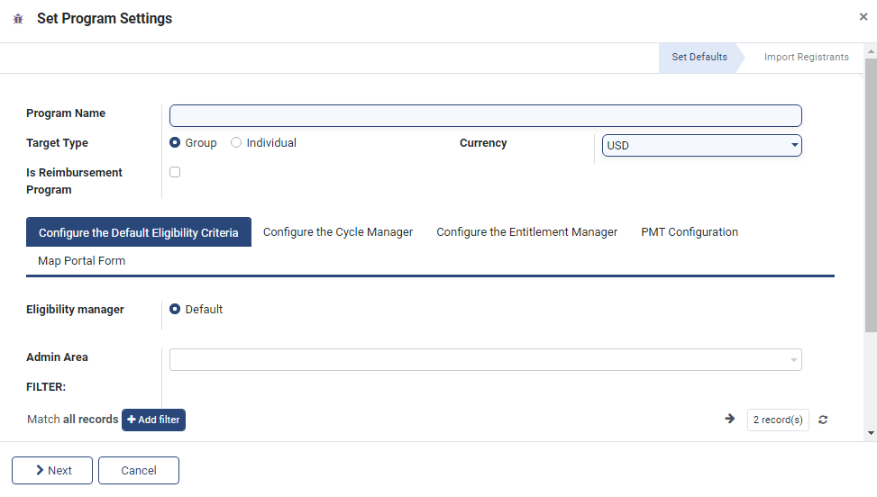 | Entitlement manger                    | <p>Select the parameters for entitlements. The valid values are:</p><ul><li>Default</li><li>In-Kind</li><li>Cash</li></ul>                                                                                                                                                                                            |
