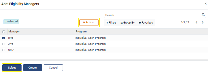 1. Check the required Manager in the list, it enables the ***Select, Action*** button. It also shows the number of entries selected.