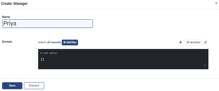 <table><thead><tr><th width="185">Feature</th><th>Description</th></tr></thead><tbody><tr><td>Name</td><td>Enter the name of the Eligibility manager</td></tr><tr><td>Domain</td><td>Set the eligibility criteria's using <em><strong>Add Filter</strong></em> button on the creation page.</td></tr><tr><td>Match all records</td><td>Retrieves the data which matches all records</td></tr><tr><td><img src="https://1895884874-files.gitbook.io/~/files/v0/b/gitbook-x-prod.appspot.com/o/spaces%2FnKdOHLbjDdIln1QDNwSx%2Fuploads%2Fgit-blob-e0df5956b60c1385b9bb3c387bd0e70d2c0ccb32%2Fnumber-of-records.png?alt=media" alt="" data-size="original"></td><td><p>Click the <em><strong>Records</strong></em> button. The <em><strong>Selected records</strong></em> screen is displayed.</p><p><em>Note:</em></p><ul><li><em>By default the list of three records are listed in the <strong>Selected records</strong> screen.</em></li><li><em>Click the <strong>Cancel</strong> button to close the <strong>Selected records</strong> screen.</em></li></ul></td></tr><tr><td><img src="https://1895884874-files.gitbook.io/~/files/v0/b/gitbook-x-prod.appspot.com/o/spaces%2FnKdOHLbjDdIln1QDNwSx%2Fuploads%2Fgit-blob-6005b223022a4c82d102fe64730d8448fa844d44%2Freferesh-button.png?alt=media" alt="" data-size="original"></td><td>Click the <em><strong>Refresh</strong></em> button to refresh the screen</td></tr><tr><td>Add filter</td><td><p>Click the <em><strong>Add filter</strong></em> button to set eligibility criteria using Domain Filters. You may set multiple eligibility criteria.</p><ol><li>Click the <em><strong>Add filters</strong></em> button. The multiple criteria fields are displayed.</li><li>Select the multiple criteria such as ID, condition and count.</li><li>Click the <strong>x</strong> button to remove the entry in the criteria fields.</li><li>Click the <strong>+</strong> button to add new multiple criteria field.</li><li>Click the <strong>...</strong> option to display fields in <em><strong>Any of</strong></em> section. The multiple criteria fields are displayed.</li></ol><p><em>Note: You can click the <strong>...</strong> option to add n number of <strong>Any of</strong> section</em></p><ol start="6"><li>The value chosen in the multiple criteria fields are displayed in the <em><strong>Code editor</strong></em>.</li><li>In the Match records chose one of the followings:</li></ol><ul><li>Select <em><strong>All</strong></em> to display the data belongs to <em><strong>All</strong></em> section</li><li>Select <em><strong>Any</strong></em> to display the data belongs to <em><strong>Any</strong></em> <em><strong>of</strong></em> section</li></ul></td></tr></tbody></table>