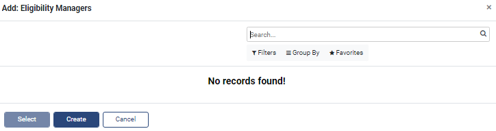 <table><thead><tr><th width="130">Feature</th><th>Description</th></tr></thead><tbody><tr><td>Search</td><td>This field is filled when the available option are selected in Filers, Group By, Favorites</td></tr><tr><td>Filters</td><td><p>Click the <em><strong>Filters</strong></em> link and then select Add Customer Filter.</p><ul><li>Add Customer Filter</li></ul><p>The advanced filter option allows you to define conditions and criteria to refine the search results.</p><ul><li>Select the <em><strong>Add Customer filter</strong></em> and then select the appropriate option in the first drop-down to display the specific data based on the option selected.</li><li>Select the criteria in second and third drop-down to refine the search results.</li><li>Click the <em><strong>Apply</strong></em> button to display the data based on the search.</li></ul><p><em>Note: To enhance the search, click the <strong>Add a condition</strong> button and follows the steps given in <strong>Add Customer Filter</strong> option.</em></p></td></tr><tr><td>Group by</td><td><ul><li>Click the <em><strong>Group By</strong></em> link, select <strong>Add Custom Group</strong> and then select the appropriate options in the drop-down to display the specific data based on the option selected.</li><li>Click the <em><strong>Apply</strong></em> button to display the data based on the search.</li></ul></td></tr><tr><td>Favorites</td><td><ul><li><p>Click the <em><strong>Favorites</strong></em> link, select <strong>Save current search</strong> and then check the appropriate options. The valid values are:</p><ul><li>Use by default</li><li>Share with all users</li></ul></li><li>Click the <em><strong>Save</strong></em> button to display the data based on the search.</li></ul></td></tr><tr><td>&#x3C;</td><td>Click the <em><strong>Left</strong></em> arrow to go the previous screen</td></tr><tr><td>></td><td>Click the <em><strong>Right</strong></em> arrow to go the next screen</td></tr><tr><td>Create</td><td>Click the <em><strong>Create</strong></em> button to Eligibility Managers</td></tr></tbody></table>
