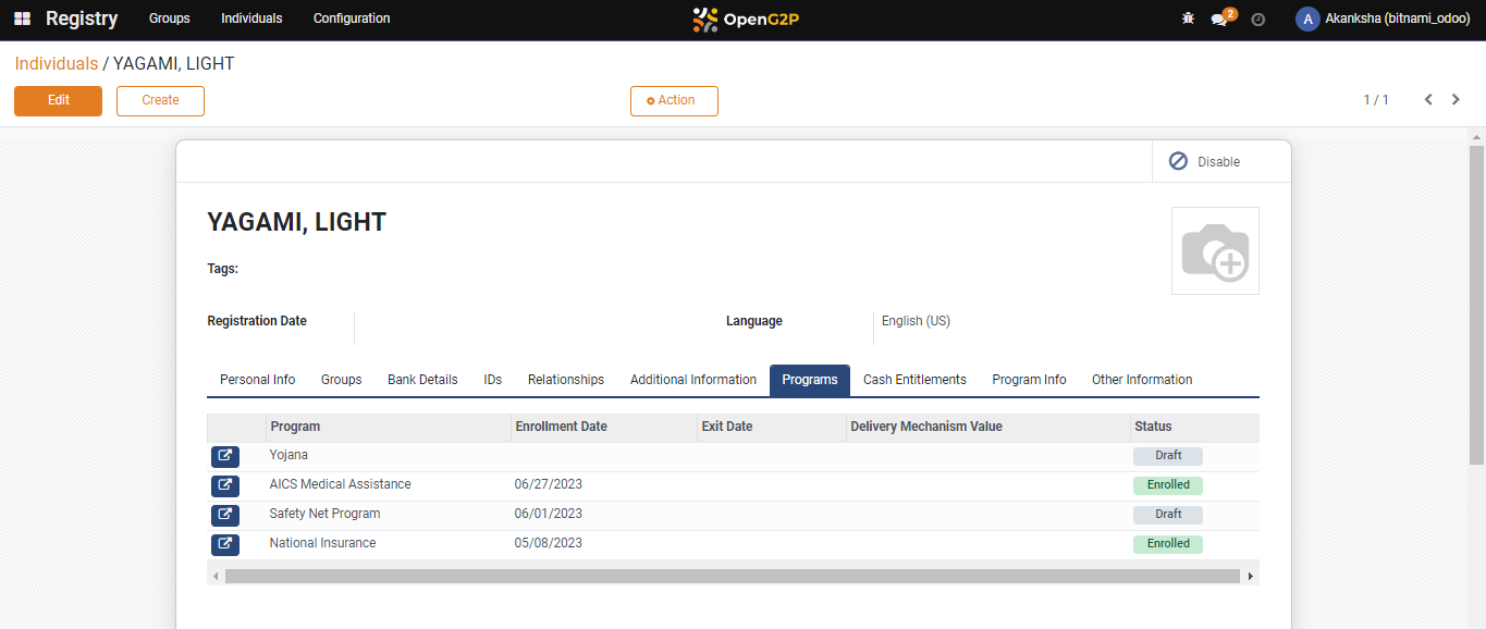 24. Once the program form is submitted, the program will be added to the ***My Programs*** section with the ***Submitted*** status and the beneficiary will be registered to the program. You can find the details in the ***OpenG2P Registry** Individual* as well.