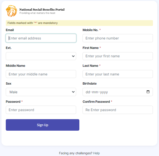 You must modify the URL <https://selfservice.sandbox.your.org> based on your installation hostname. The beneficiary must ***Sign Up*** to register his/her details. After registration, the beneficiary can login using the login credentials.