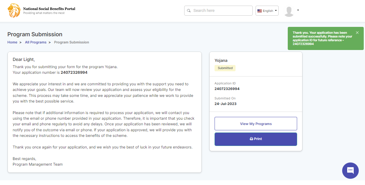 After the application is submitted successfully, you will receive a confirmation message on submitted program.