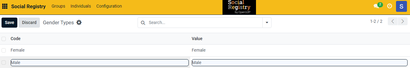 5. Enter the relevant [Gender Types](https://docs.openg2p.org/1.3/social-registry/features/configurations/..#gender-types) in the ***Code*** field.