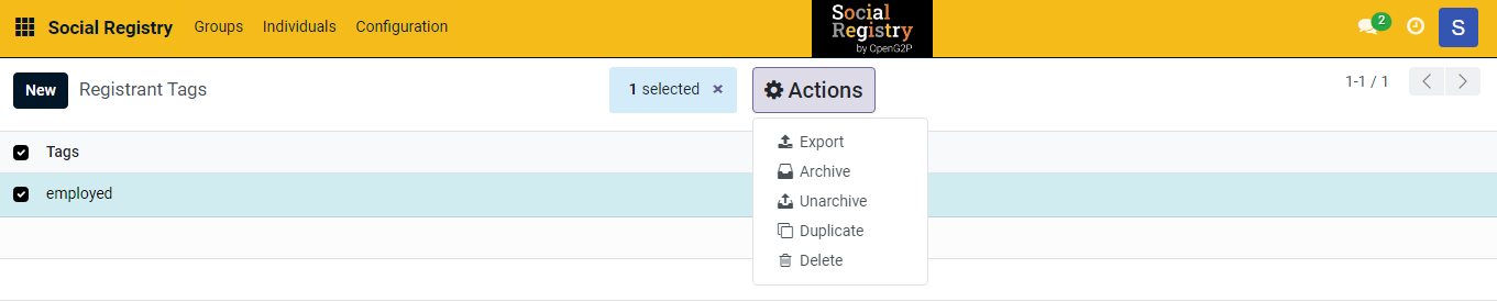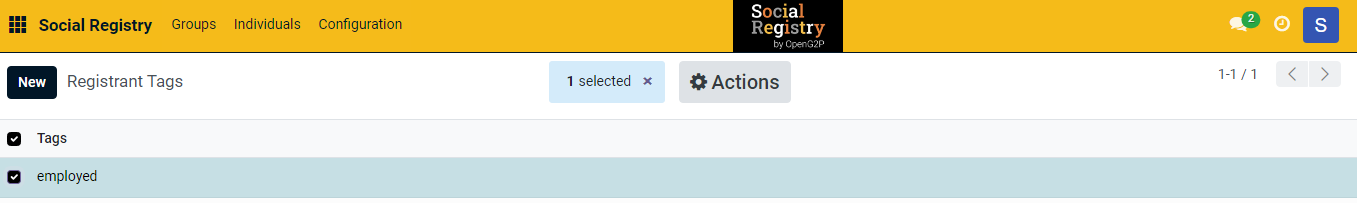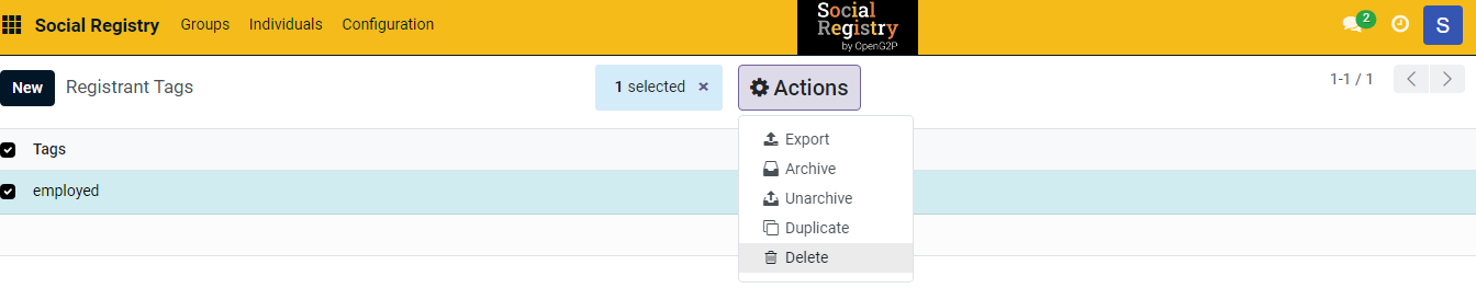 9. Select the registrant tag you want to delete. It enables the ***Actions*** button. It also shows the number of selected tags you want to delete.