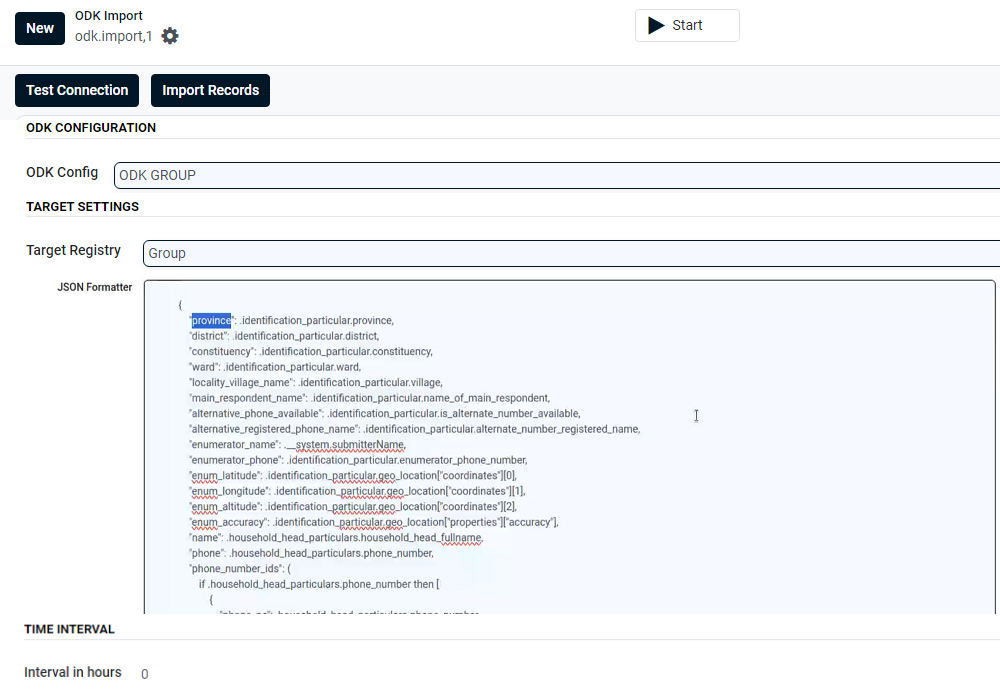 After the ODK configuration, the fields/parameters in the ODK form are mapped to the relevant fields in SR module using the JSON formatter. Navigate to the path Social Registry -> ODK -> ODK Import -> New. To learn more on ODK Import, refer to [Configure and Import ODK Form](https://docs.openg2p.org/1.3/social-registry/features/odk-importer/user-guide/configure-and-import-odk-form).