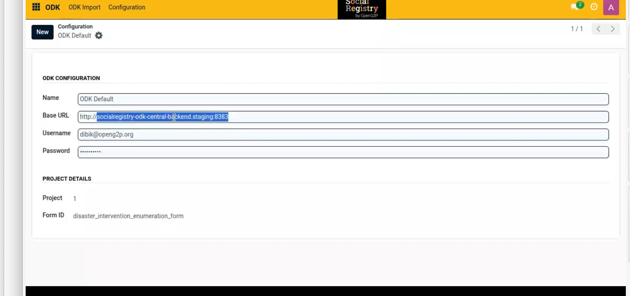 After the computation of required fields in SR, the SR module built on Odoo platform needs to be integrated with ODK Central to facilitate data collection and integration. SR module must be set up to automatically pull data from the ODK forms located in the ODK Central. Navigate to the path Social Registry -> ODK -> Configuration -> New. To learn more on Configuration, refer to [Configure and Import ODK Form](https://docs.openg2p.org/1.3/social-registry/features/odk-importer/user-guide/configure-and-import-odk-form).