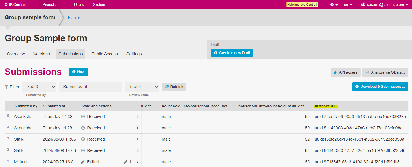5. Find the Instance ID in the current list of submitted ODK forms.