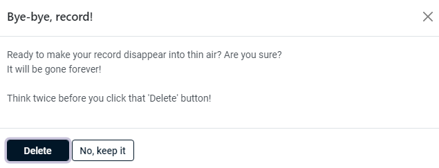 20. Click the ***Delete*** button in the ***Bye-bye, record!*** dialogue box screen to delete the user
