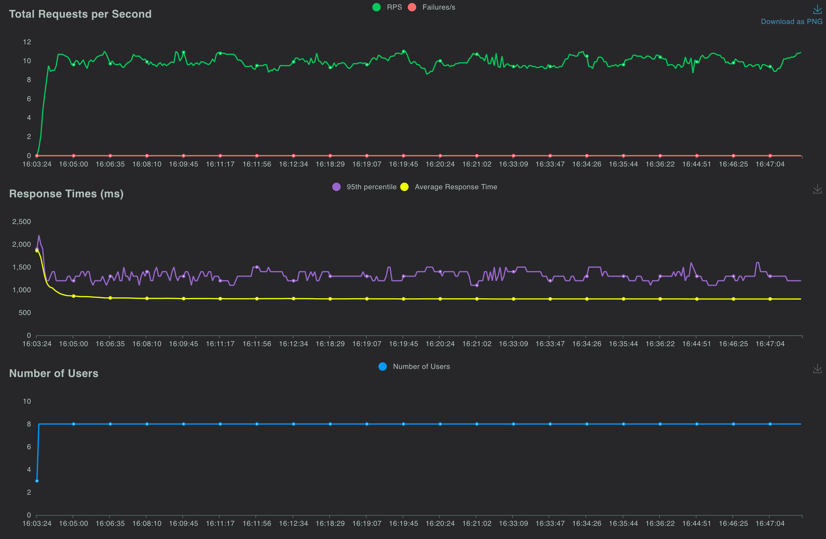 <figure><img src="https://1895884874-files.gitbook.io/~/files/v0/b/gitbook-x-prod.appspot.com/o/spaces%2FnKdOHLbjDdIln1QDNwSx%2Fuploads%2Fgit-blob-74ba673a006a8f6df4d7b214247ba30942e48f56%2FDuringTest-8x1000-Locust-Dashboard.png?alt=media" alt=""><figcaption><p>Locust Dashboard - 30 minutes - 8 concurrent users - 1000 records per API</p></figcaption></figure>