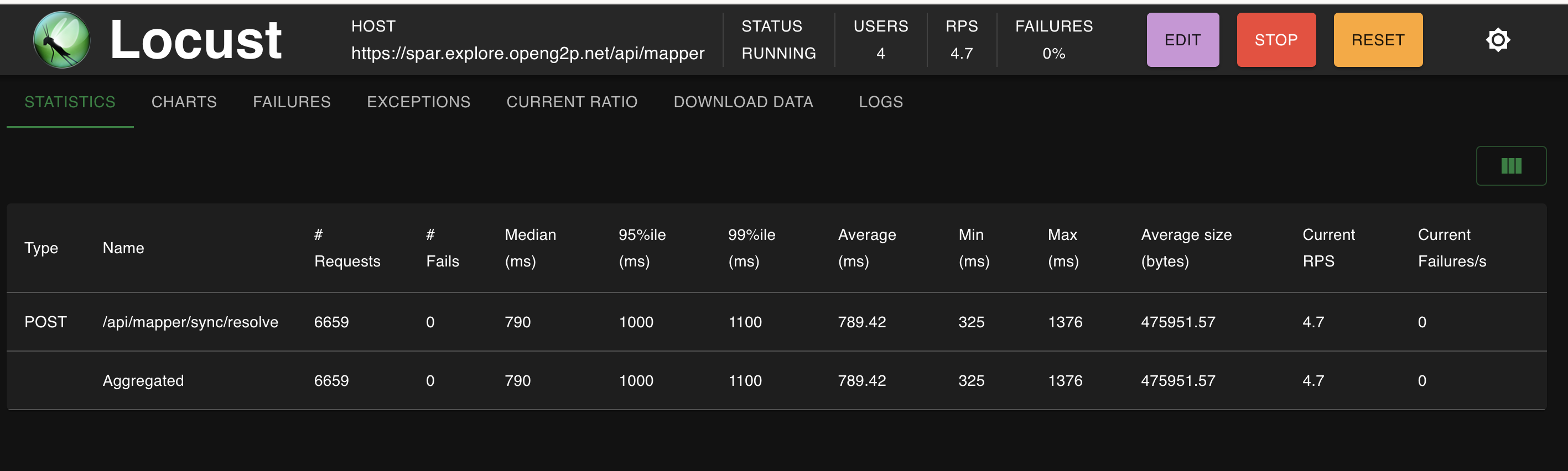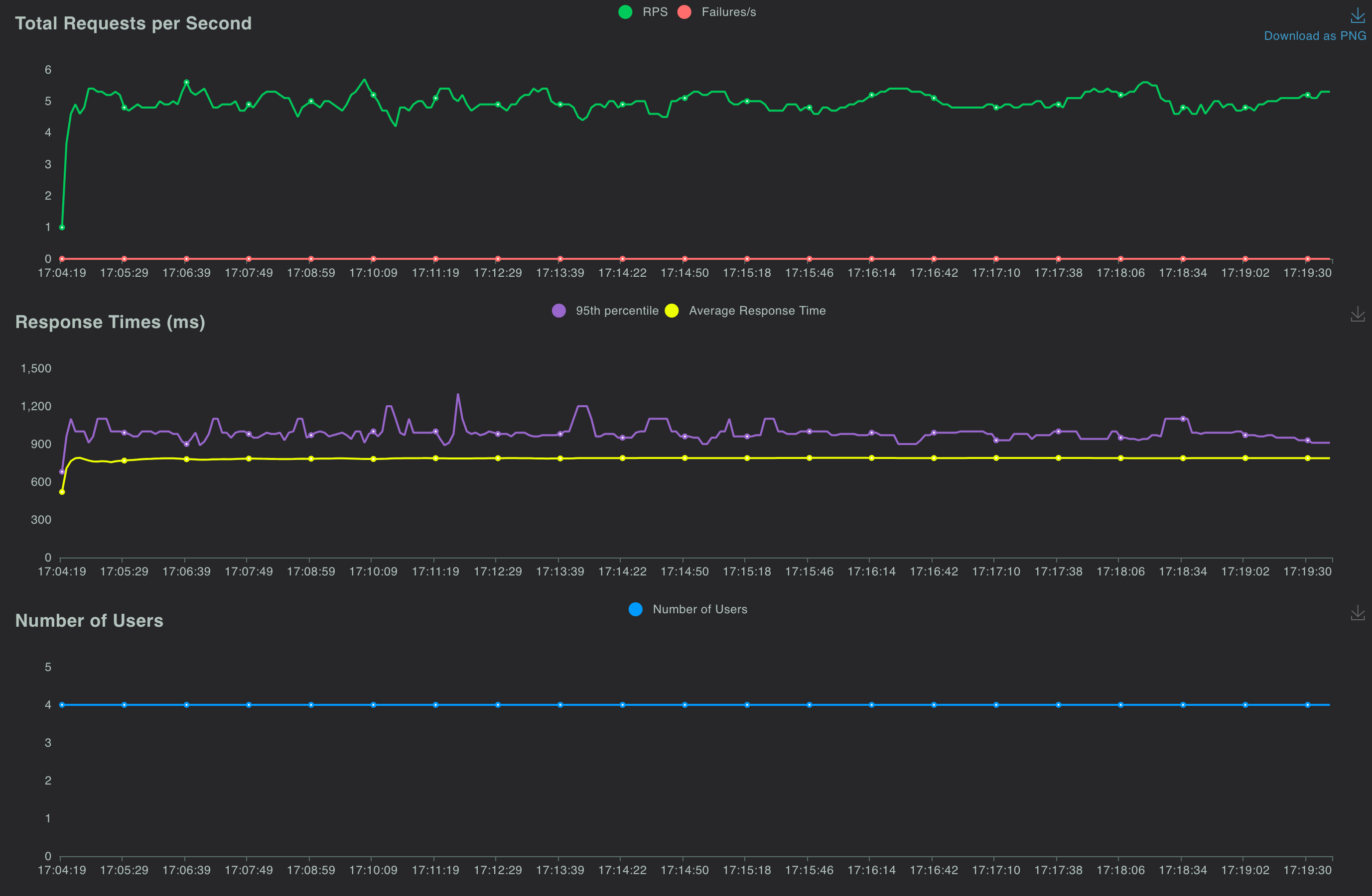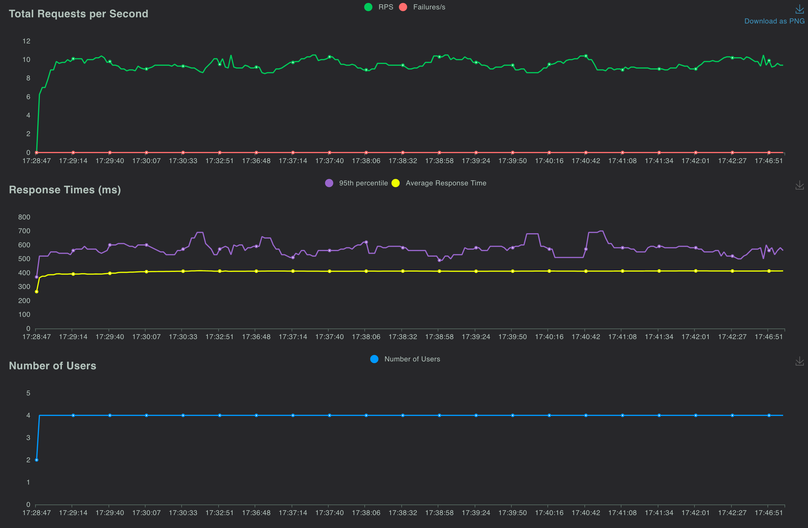 <figure><img src="https://1895884874-files.gitbook.io/~/files/v0/b/gitbook-x-prod.appspot.com/o/spaces%2FnKdOHLbjDdIln1QDNwSx%2Fuploads%2Fgit-blob-dd5146786b0bcf45958aae6e53ca7757f982b7bb%2FDuringTest-4x2000-Locust-Stats-2.png?alt=media" alt=""><figcaption><p>Locust Dashboard - 30 minutes - 4 concurrent users - 2000 records per API</p></figcaption></figure>