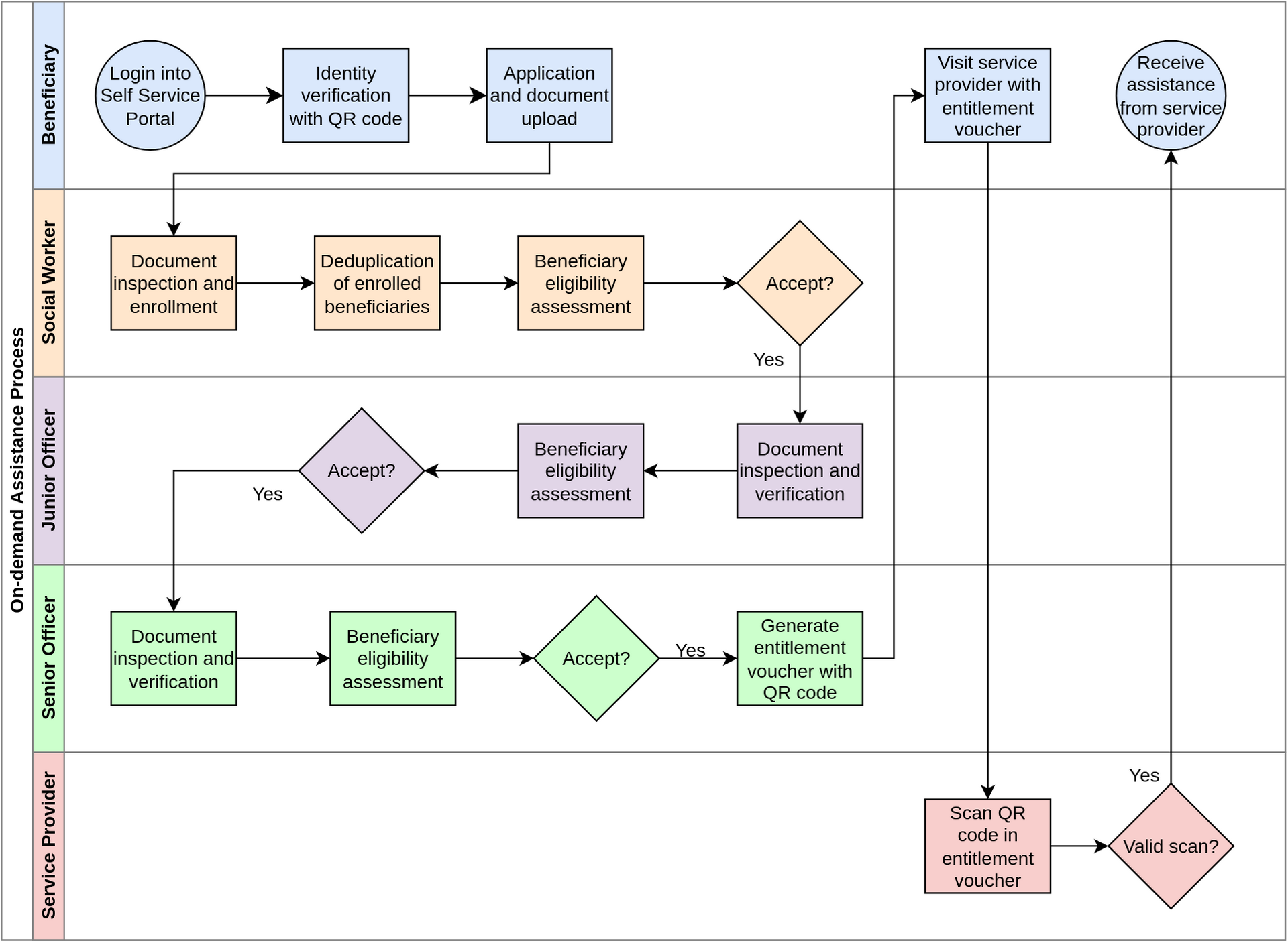 Immediate assistance is especially useful for scenarios like urgent surgeries, treatments, and other crises. However, to prevent instances of fraud, it is imperative to do a thorough assessment of beneficiary entitlement. This section details on one such implementation using multiple stages of approvals.