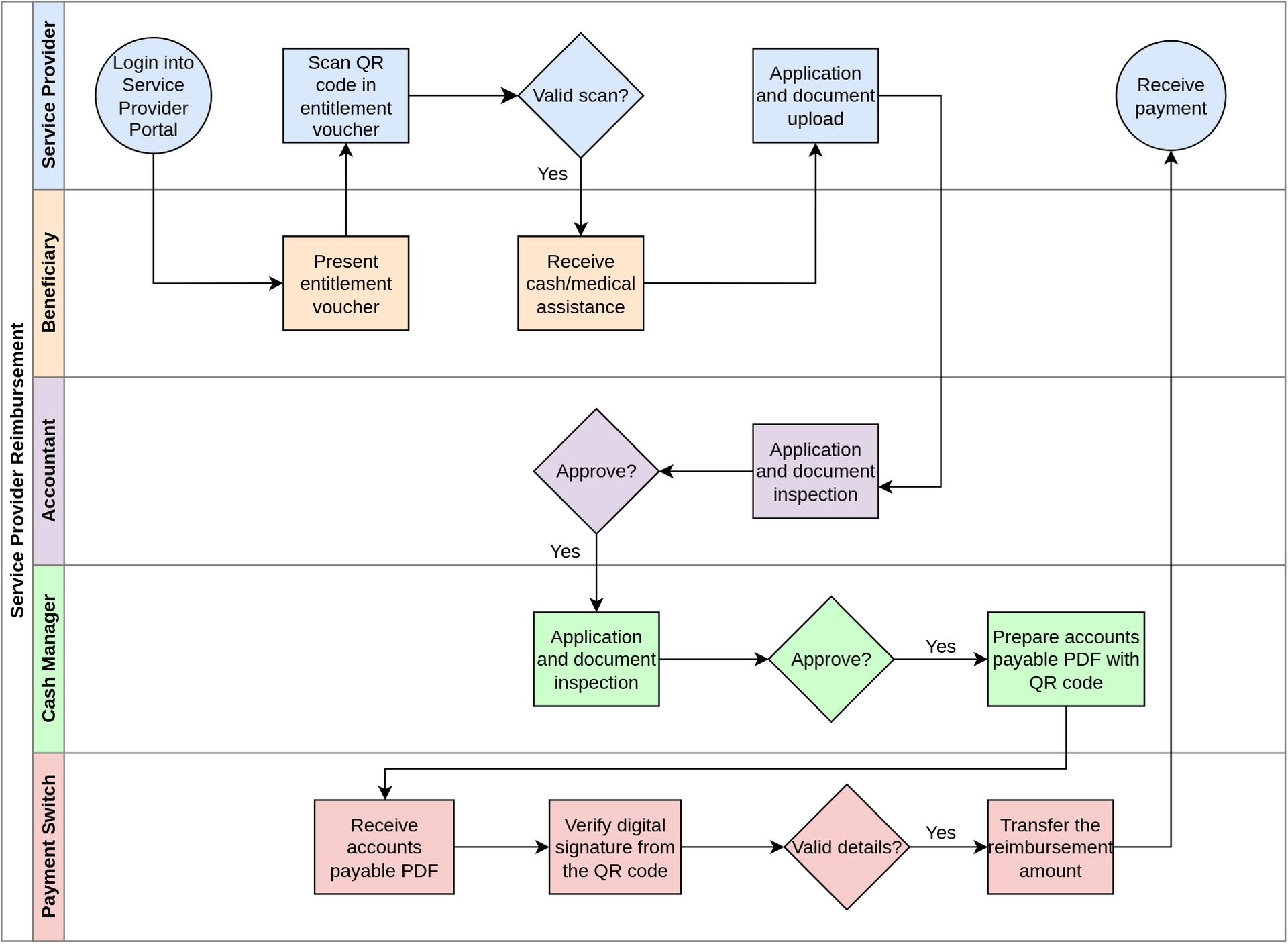 OpenG2P has a reference implementation for the Service Provider Portal. A service provider can submit the reimbursement application on this portal after assisting the beneficiary. Subsequently, the reimbursement request is inspected and approved by accountants and cash managers. Post reimbursement approval, the payment switch transfers the reimbursement amount to the service provider account.