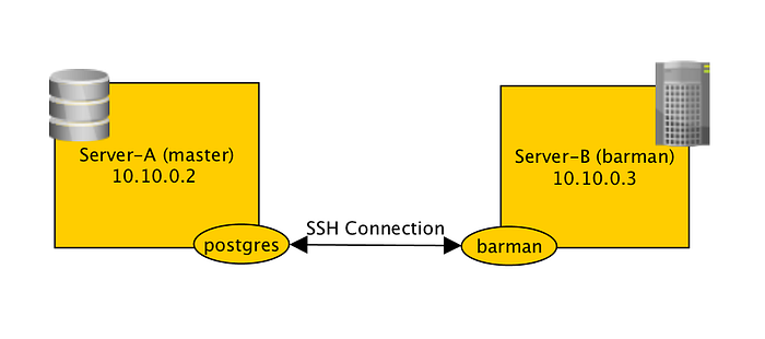 We want to establish trusted ssh connection between postgres@server-a and barman@server-b so that server-a can send WAL files to server-b and so that barman can on server-b trigger base backup, or launch recovery.